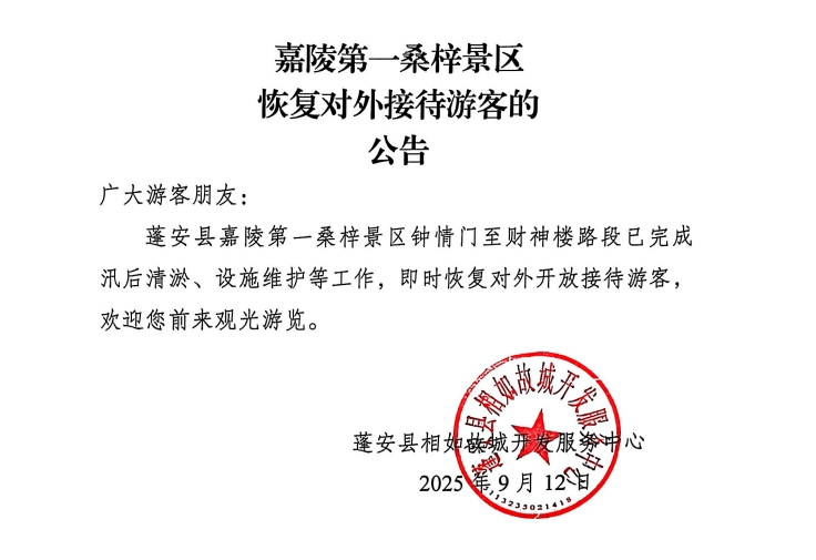 蓬安县嘉陵第一桑梓风景区游客中心停车场已恢复正常使用,祝您旅途愉快,特此公告。